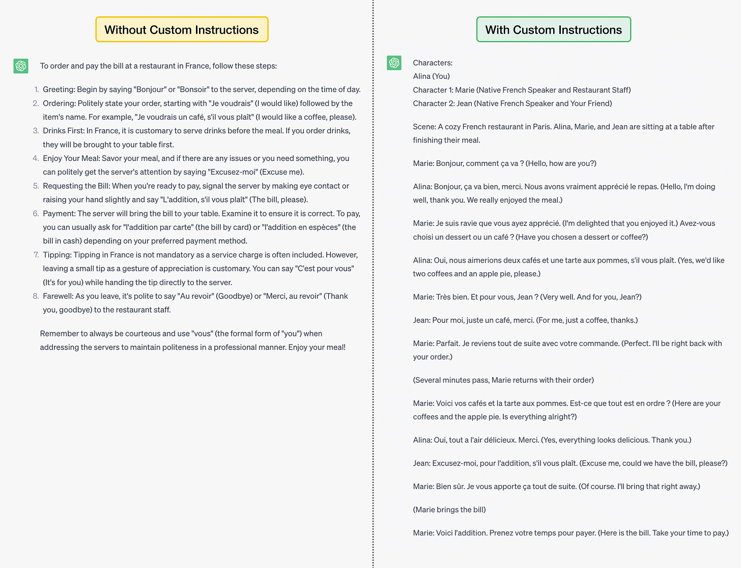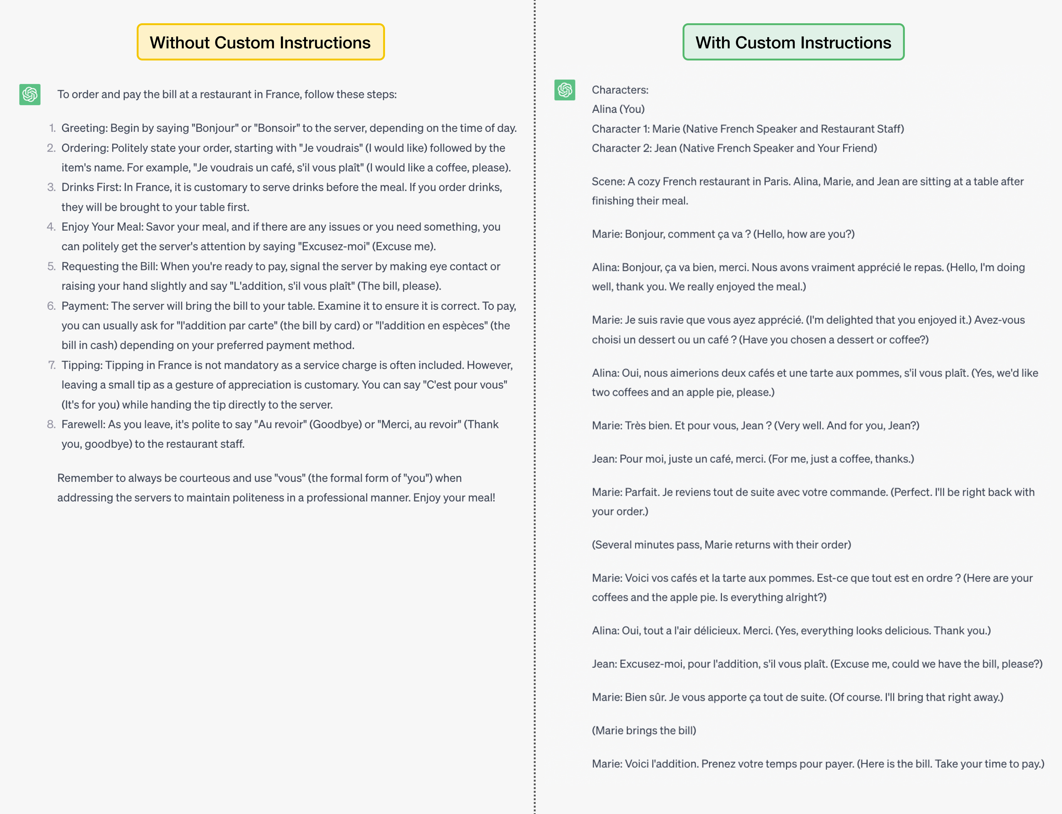 With Custom Instructions, you can specify your language learning goals and interest in conversational fluency. ChatGPT will now generate a dialogue between native French speakers in a restaurant scenario, followed by translations. This provides an engaging, real-world context to pick up nuances in vocabulary and phrasing.