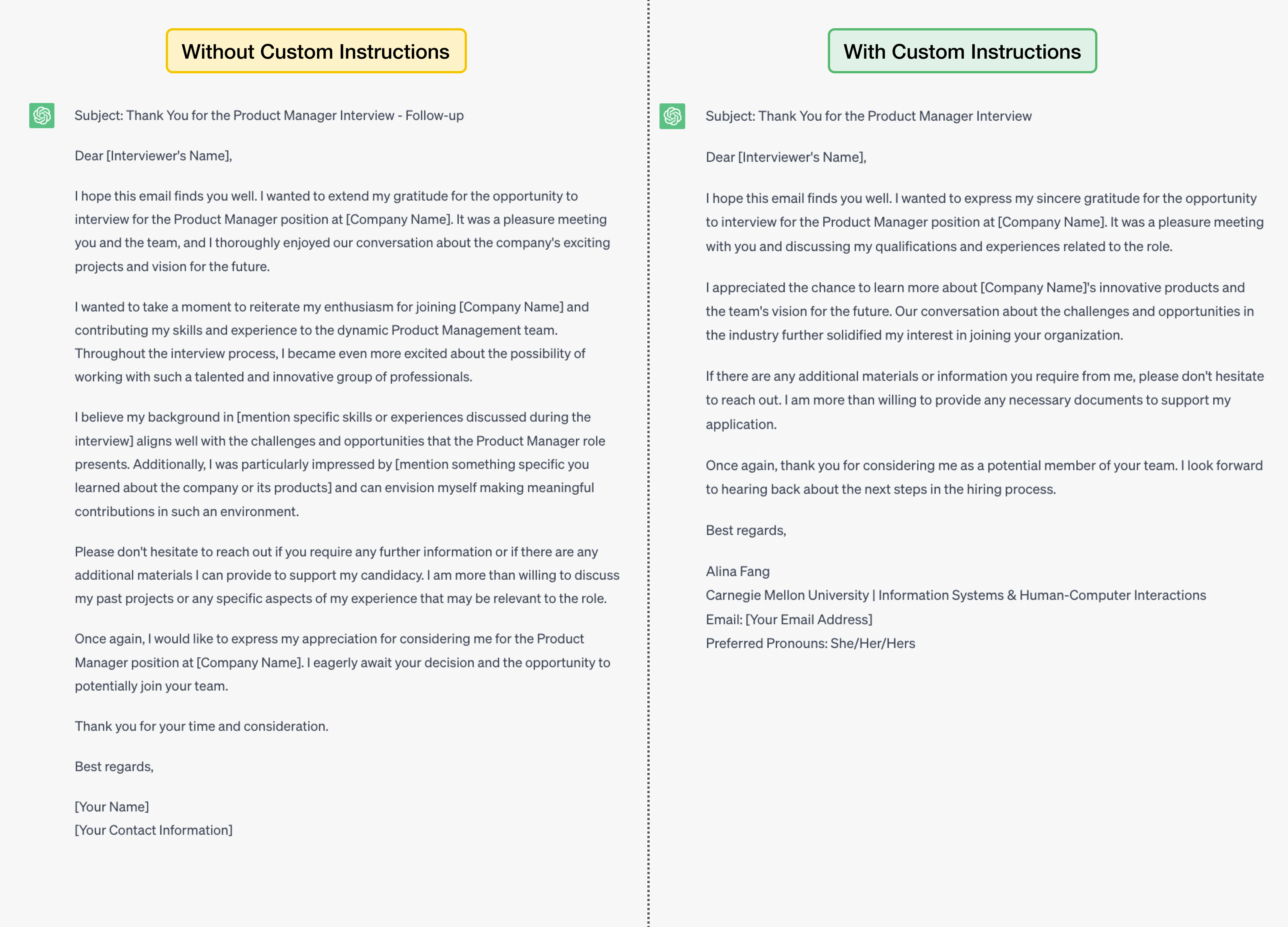 With Custom Instructions, ChatGPT generates emails tailored precisely to your needs. This saves time otherwise spent wordsmithing draft after draft to achieve the right tone. For important communications, Custom Instructions help refine your message before sending, without the back-and-forth required to calibrate ChatGPT's response.