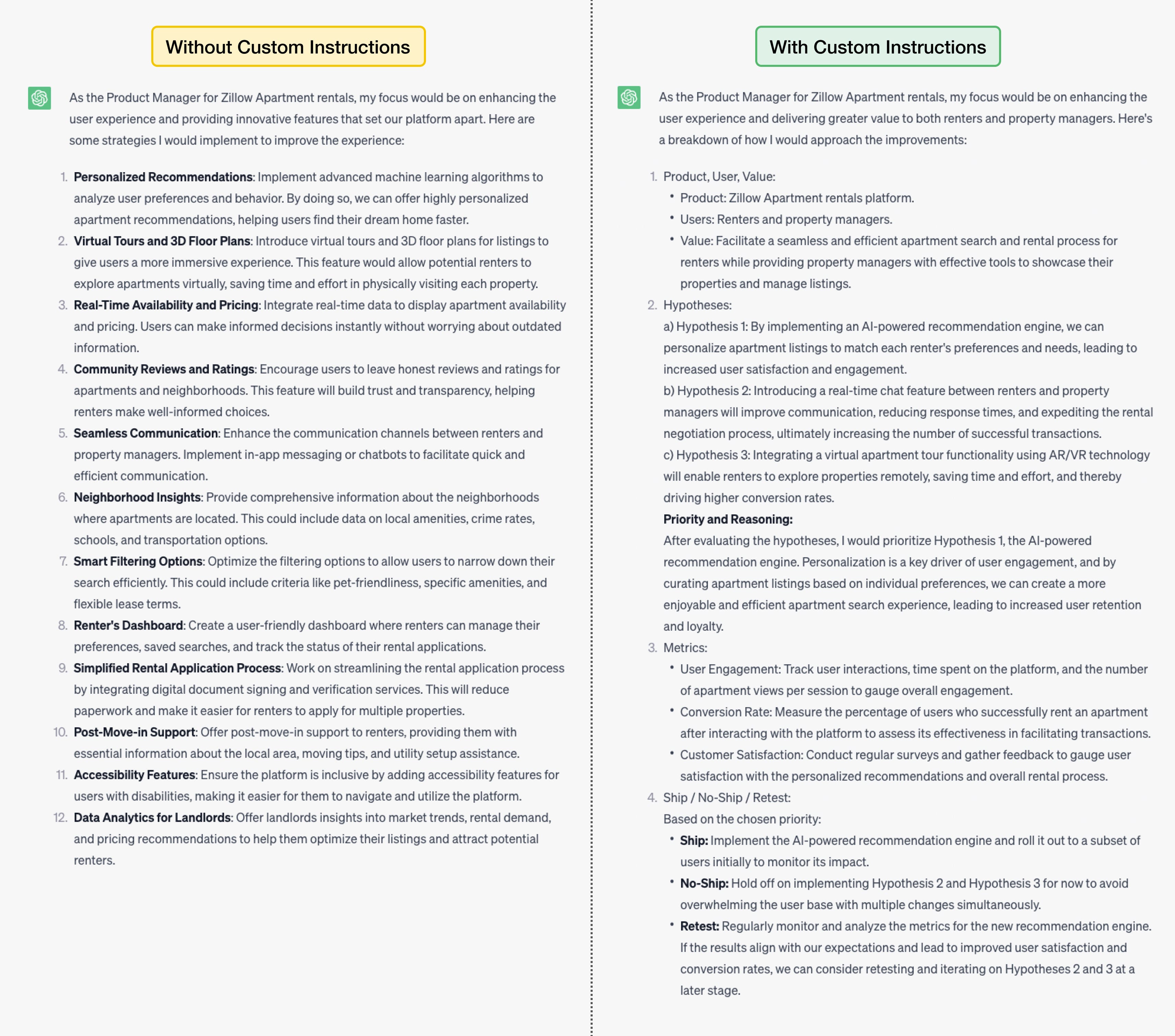 Without Custom Instructions, ChatGPT normally responds with a generic list of ideas. Useful, but not a structured framework to demonstrate strategic thinking.