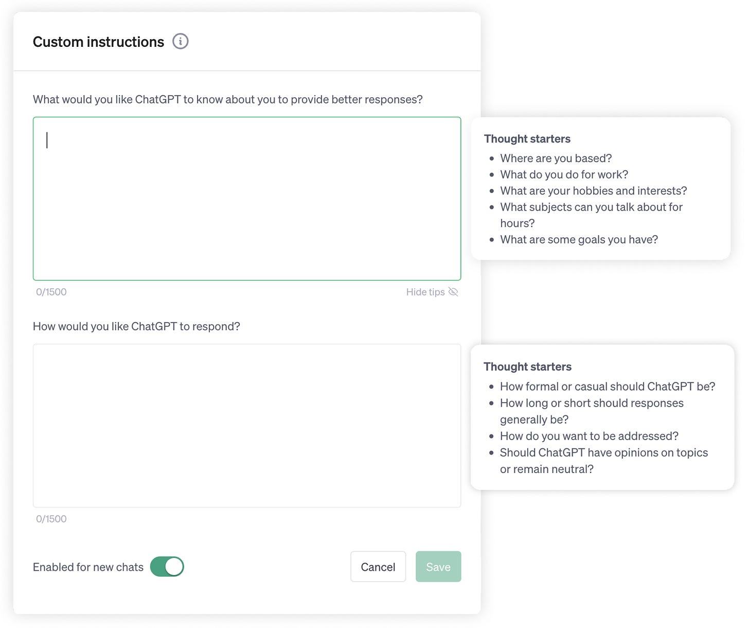 On Jul 20th, ChatGPT introduced Custom Instructions, allowing users to provide preferences that will be applied to all future conversations.